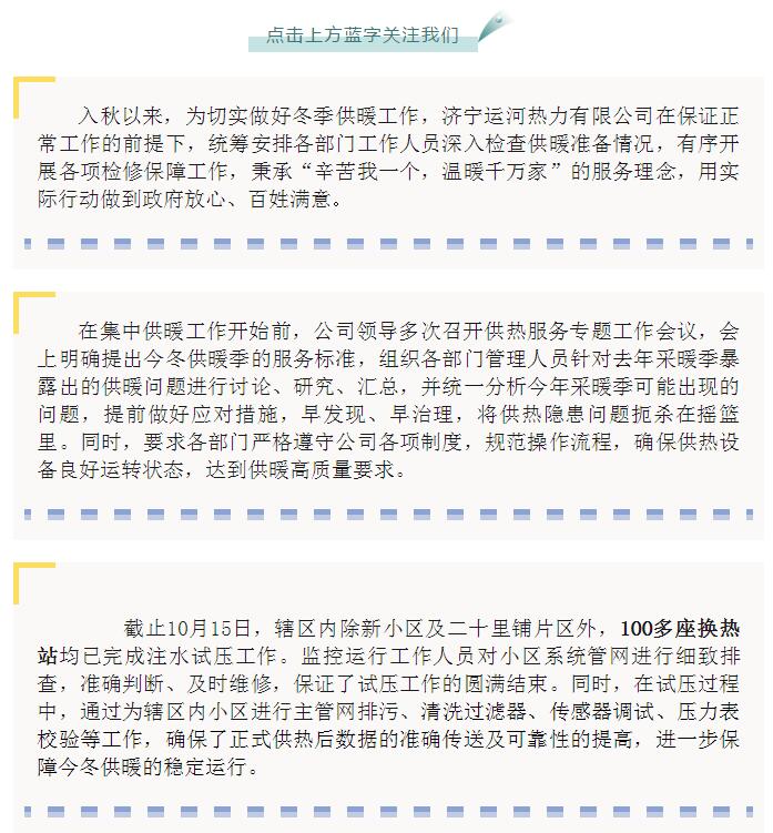 | 上一條:濟(jì)寧運(yùn)河熱力有限公司第三批小區(qū)試壓通知 | 下一條:濟(jì)寧城區(qū)新增供熱小區(qū)2809戶(hù)居民,今冬有望用上暖氣 |